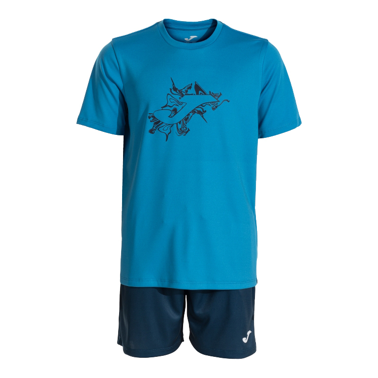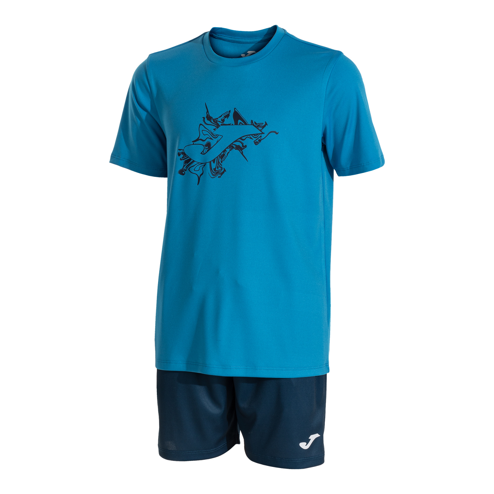 Set sportiv pentru copii. Compus dintr-o camasa cu maneca scurta si un pantalon scurt de tip bermude. Camasa are guler rotund cu covertape, iar pantalonul scurt are talie elastica si snur pentru a se ajusta usor pe corpul copilului. De asemenea, include doua buzunare laterale.