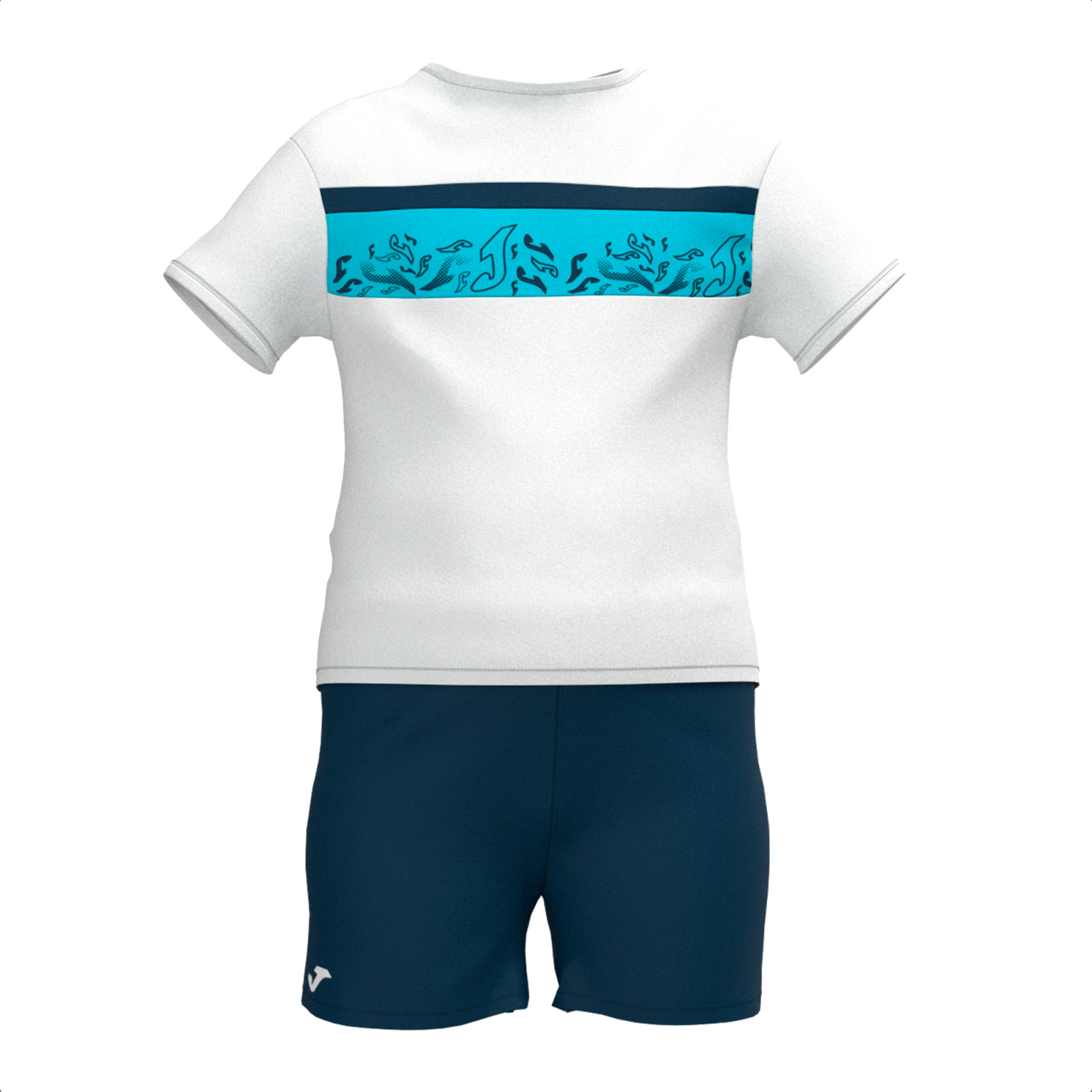 Acest set de vară este format dintr-un tricou cu mâneci scurte, cu gât rotund. Se remarcă prin imprimarea distractivă personalizată cu sigle Joma amplasate pe o piesă în culoare contrastantă. În plus, vine cu pantaloni scurți cu talie elastică și șnur reglabil pentru a oferi un suport mai mare. Pe laterale, are doua buzunare mari fara inchidere cu fermoar.
